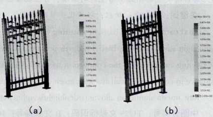 针对护栏特殊情况下的强度要求,并采用Solidworks simulation有限元模拟软件进行强度分析,具体数据如表 3 ( a、b )所示,应力云图与位移云图。